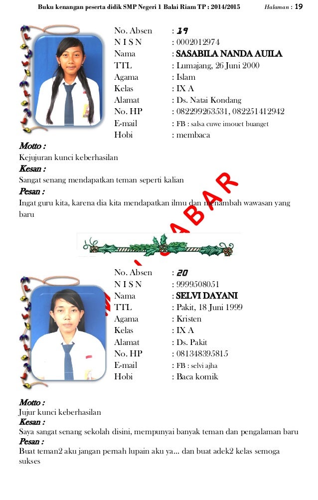 Tahukah kamu apa itu kesan dan pesan? Contoh pesan dan kesan untuk guru ppl olahraga barisan contoh. Kesan dan pesan untuk perpisahan sekolah biasanya digunakan untuk penilaian sekolah tersebut maupun digunakan untuk mengetahui perasaan murid ada ketika bersekolah disekolahan tersebut. Ilmu agama saya masih dangkal dibanding mereka. Kesan dan pesan setelah masa perpisahan atau lulus sekolah biasanya para siswa diminta untuk memberikan kesan dan pesan untuk sekolah tersebut entah untuk ditulis dalam sebuah buku kenangan ataupun diucapkan. Saat mengisi biodata untuk buku tahunan sekolah, biasanya data yang diminta adalah seputar nama lengkap, nomer kontak yang bisa dihubungi, alamat, dan juga sosial media agar bisa dengan mudah untuk menyambung silaturahmi di waktu yang akan datang. Hal itu yang awalnya membuat saya merasa minder dan takut berteman. Contoh kata kenangan pesan dan kesan untuk teman dan guru pesan dari guru untuk siswa nama. Kesan dan pesan untuk sekolah #5. Saya sadar, begitu banyak kesalahan yang sudah dilakukan, tentunya membuat kesal bapak/ ibu guru, untuk itu saya mohon maaf. Banyak kegiatan yang tidak bisa terlupakan saat di sekolah. Oleh karena itu, tidak ada salahnya kita memberikan pesan … Contoh kesan dan pesan perpisahan sekolah 1 kesan.