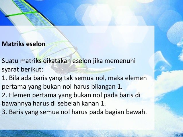 Matriks dalam bentuk itu dikatakan dalam bentuk eselon baris tereduksi. 1.) di setiap baris, angka pertama selain 0 harus 1 (leading 1).2.) jika ada baris yang semua elemennya nol, maka harus dikelompokkan di baris akhir dari matriks. Suatu matriks dikatakan dalam bentuk eselon baris, jika memenuhi ketiga syarat berikut. Aturan khusus itu adalah sebagai berikut : 2 jika ada baris yang semua elemennya nol maka harus dikelompokkan di baris akhir dari matriks.